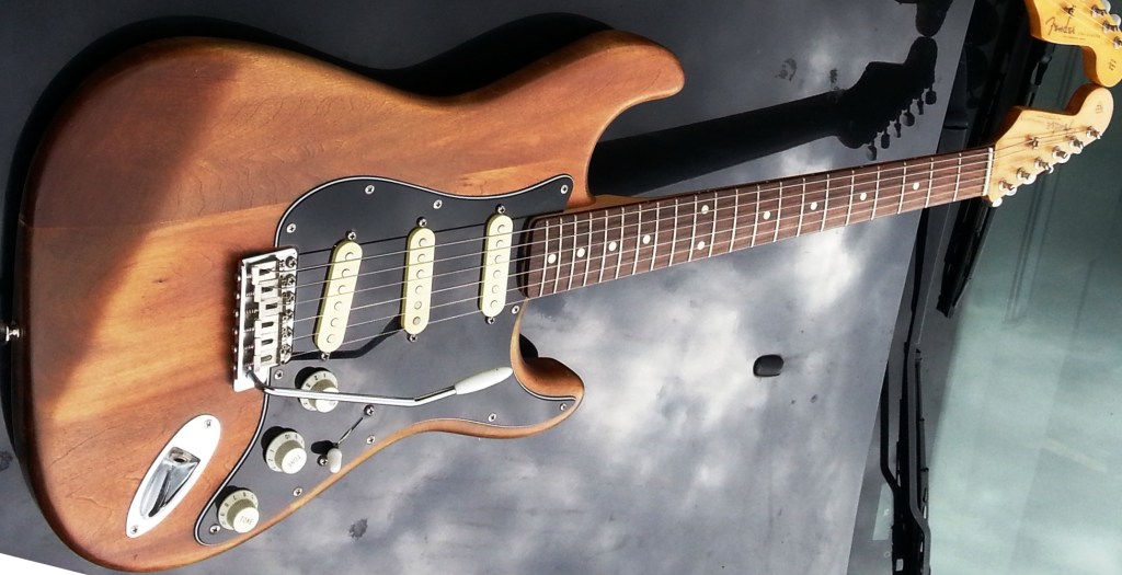 In the process, I inherited the white Strat body and set out on a mission, inspired, chiefly, by a stripped early 60s Strat I’d recently admired in the hands of one of the guitar players in Marcus Malone’s band. I stripped the body (if you look hard, you can still see a bit of white in the trem cavity!), stained it dark brown and oiled it so it looked like an old body which had been stripped and then sweated into for about 40 years!