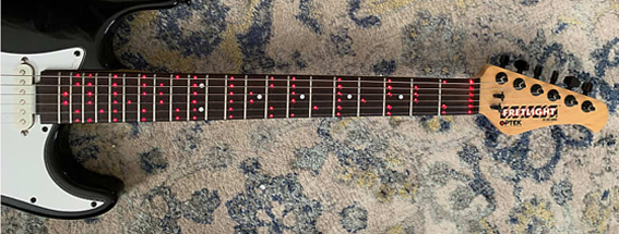 A “fretlight” guitar similar to the one which donated the body for this project after its neck got smashed in transit.