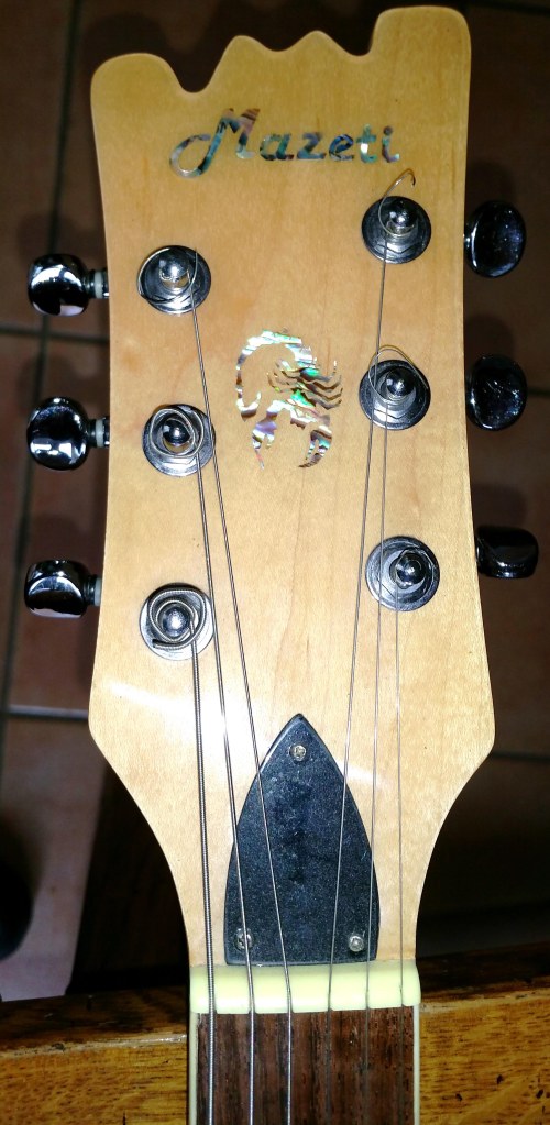 As I recall it, the Mazeti cost me £120 brand new from another dealer on eBay. When I won the auction (it was the second one I’d bid on and I was beaten first time around) I couldn’t quite believe the bargain I’d got. When it arrived, the extent of the bargain became even more apparent. This was a GREAT guitar – a bit on the weighty side, maybe, but quirky, beautfully made, a real looker and fitted with a pair of viciously hot, but incredibly toneful soapbars. The Bigsby trem was a bonus – to this day, it’s the only guitar I’ve ever owned with a Bigsby. (Fun to play; not so much fun to restring!)