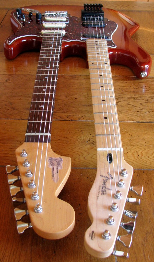 It seemed such a good idea. I spotted this amazing-looking Warmoth twin-neck body on eBay about 15 years ago. This was back in the days when Warmoth was at the zenith of the American guitar parts industry. (Other companies are available now.) Back then, if you were looking to put together a high-end guitar to your own exact specifications, but didn’t possess the necessary woodworking and finishing skills, Warmoth could oblige – at a price. I spent almost as many hours dreamily perusing the neck and body options on the Warmoth website as I did trawling eBay for bargains. While gazing slack-jawed at all the options I’d also dwelled more than once on the super-pricey twin-neck bodies on offer. You could have a twin-neck Strat, half Strat and half Tele, or even a combination of a Strat and a Precision bass. Truly the stuff of guitaistic freakshow fantasy! The starting prices were in the £400 region, depending on how rare/exotic was your choice of timber.