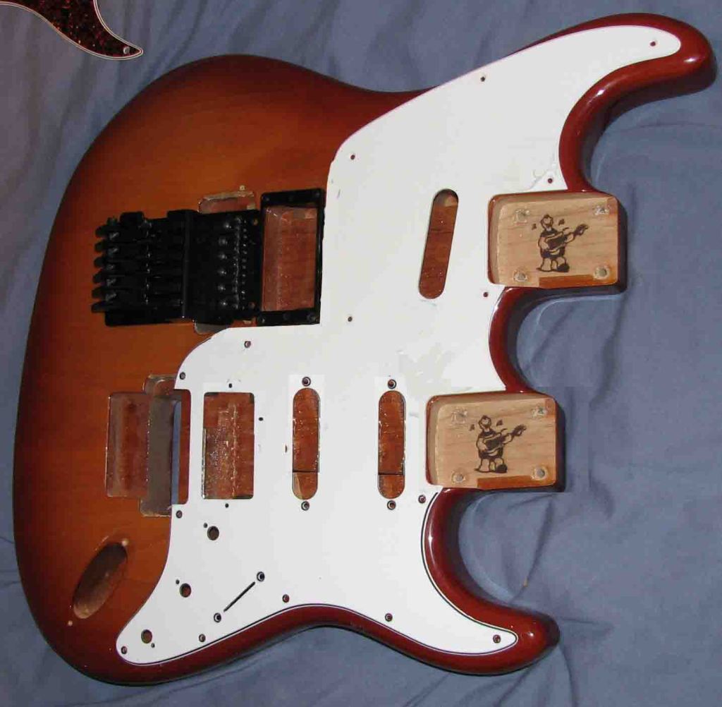 Those horrible Floyd Rose trem back-routs were a problem – solved by my dear old pal Simon Pyke, whose woodworking skills greatly exceed mine. He found a couple of nice bits of hardwood and carved them to fit, so I could screw a Hipshot Trilogy to anchor the top neck and fit a standard vintage-style Strat trem (the only option I’ll countenance!) for the lower one.