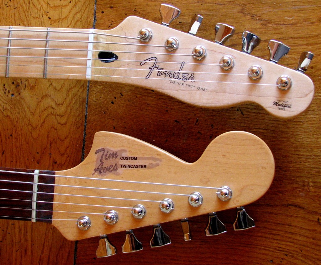 I found a genuine Squier 51 neck for sale on eBay and really lucked out with the second neck – a cheap used Warmouth large-headstock Strat neck. The Strat neck was a leftie, so the mirror-image arrangement meant the tuners didn’t get in the way of each other and hell, it looked neat. Couldn’t have been better, really.