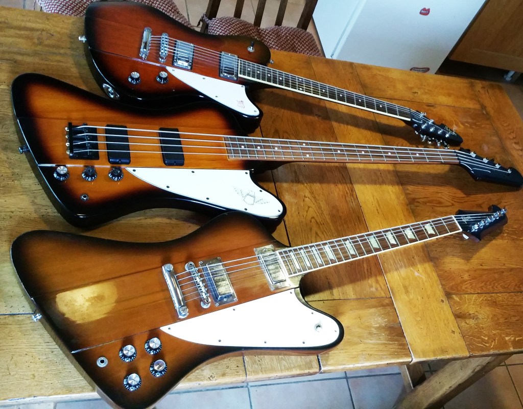 * I’ve long had a bit of a bee in my bonnet about various copies – especially the recent Gibson Studio ‘Birds, with their set necks and conventional tuners. My WOLFPACK colleague Joel Fisk had one for a while and it was a nice guitar, but it just looked WRONG! (For that matter, I never really liked the look of the later “non-reverse” Firebirds Gibson started making the mid-60s. If it ain’t broke etc etc.)