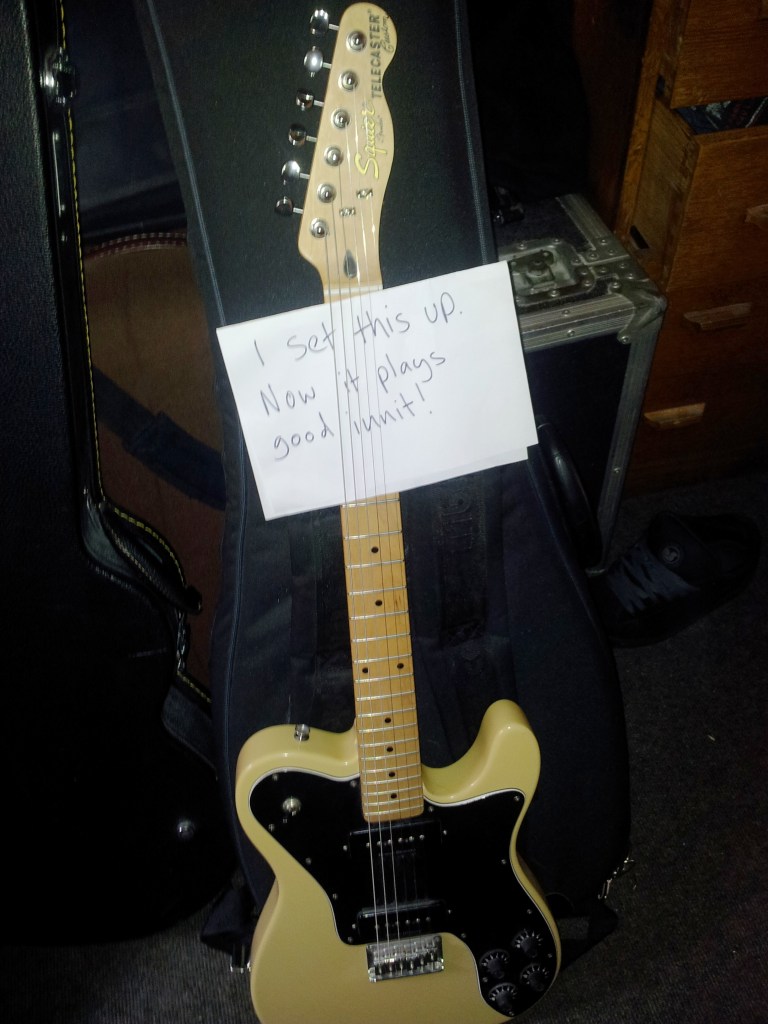 My other memory of this guitar relates to one of Owen’s rare visits home for Los Angeles. I came back one day to find the Tele sitting in my room on a stand, a bit of paper tucked in the strings with the message: “I set this up. It now plays good innit!”