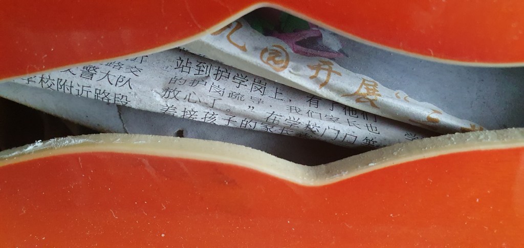 So began a fresh adventure along a road never before travelled. Never before had I owned a hollowbody guitar, let alone tried to put one together. The neck and body so cheaply won, the challenge then was to turn them into a playable, useable guitar for less than £200. A couple of days later, a rather dull and dusty orange guitar-shaped thing landed on my doorstep – the body, intriguingly, stuffed with Chinese newspaper (a cheap way to keep the paint out of the body cavity during spraying I guess). It was decently-made, though the finish was far from perfect, the fingerboard tinder-dry and the frets dangerously rough, their ends sharper than a box of cutlery. Oh and there was no nut. Just as well I like a challenge!