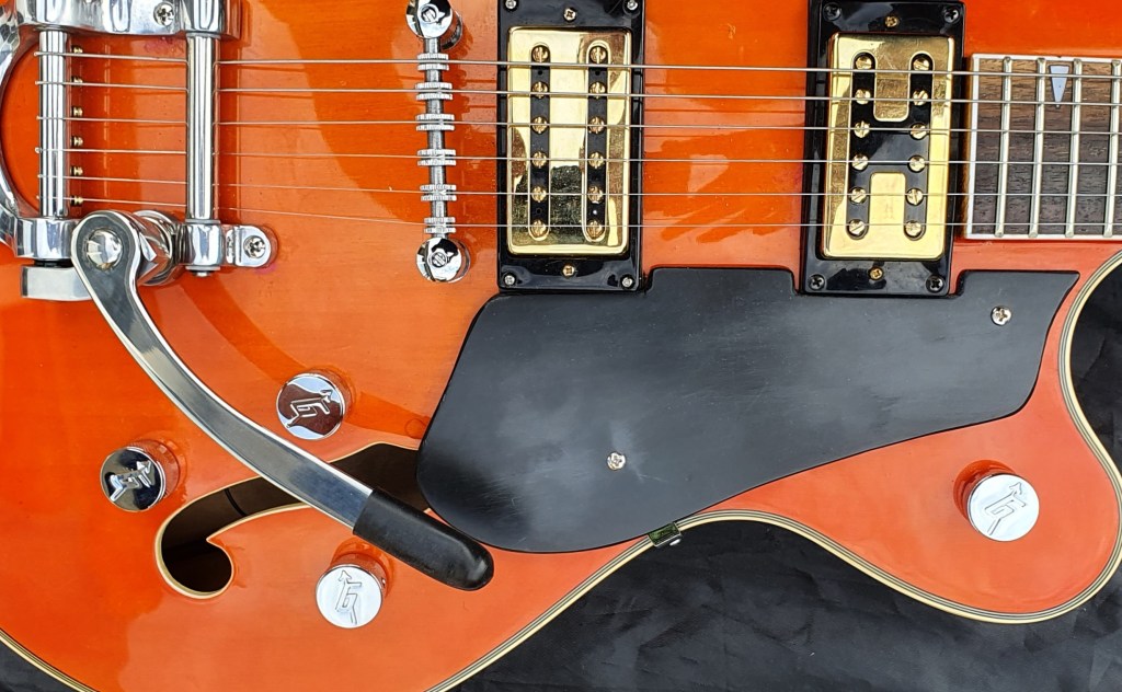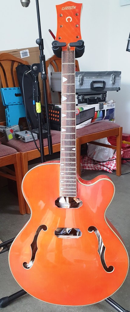 As I ran out of song ideas and guitars from my collection to write about in this blog, the lockdown opened the door for the guitar bug to bite once again. I blame my pal guitarist, songwriter and producer Richard Tuckey. He drew my attention to a guy on Facebook who was selling half-finished guitar, apparently mainly bankrupt stock from a Chinese guitar company called Pango. Among the guitars on the Alan George Guitars page was a half-built black Gretsch-style hollowbody neck and body, priced at a measly £65. He only had one left – and it was orange. Yes ORANGE! The colour – is there any other colour for a fat-bodied Gretsch? – along with the fact it had the word, “Gretsch” on the headstock and looked the part – was the clincher. All my life, I realised, I’d wanted a big, fat Gretsch hollowbody – I’d just never know that to be the case until that very moment. 🙂