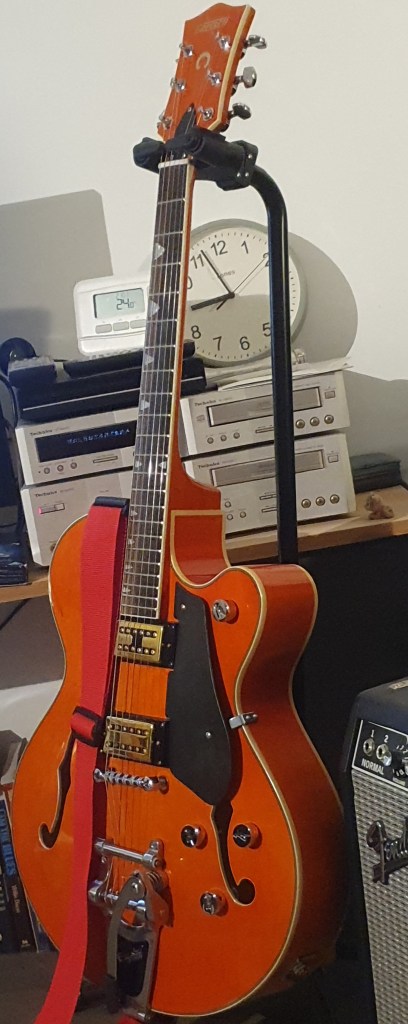 It sounds good. This is my first actual hollowbody and there’s enormous fun to be had playing such a guitar loud enough for it to be on the edge of feedback – the point where you feel the air coming out of the f-holes and it starts to sing of its own accord! The body is at least twice as thick as I’m used to and that also feels just plain weird when it’s strapped on – I’m still experimenting a strap length that works for me.