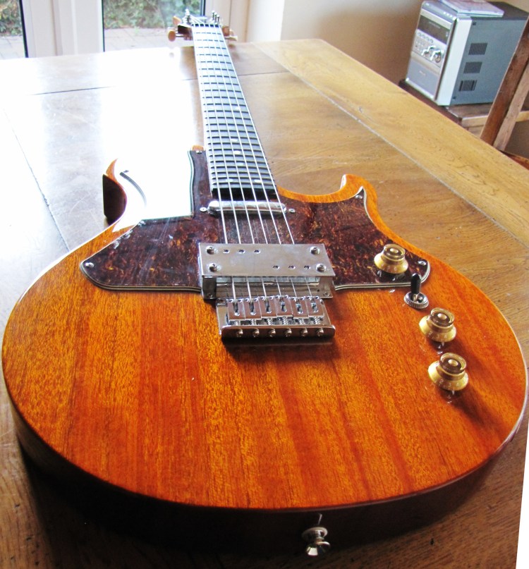 It took me ages to design a pickguard – tortoiseshell of course – that suggested a Les Paul Special guard, but also fitted the quirky outline of the R&B. The final design is some way from perfect – when I have time on my hands, I may yet have another crack at it.
