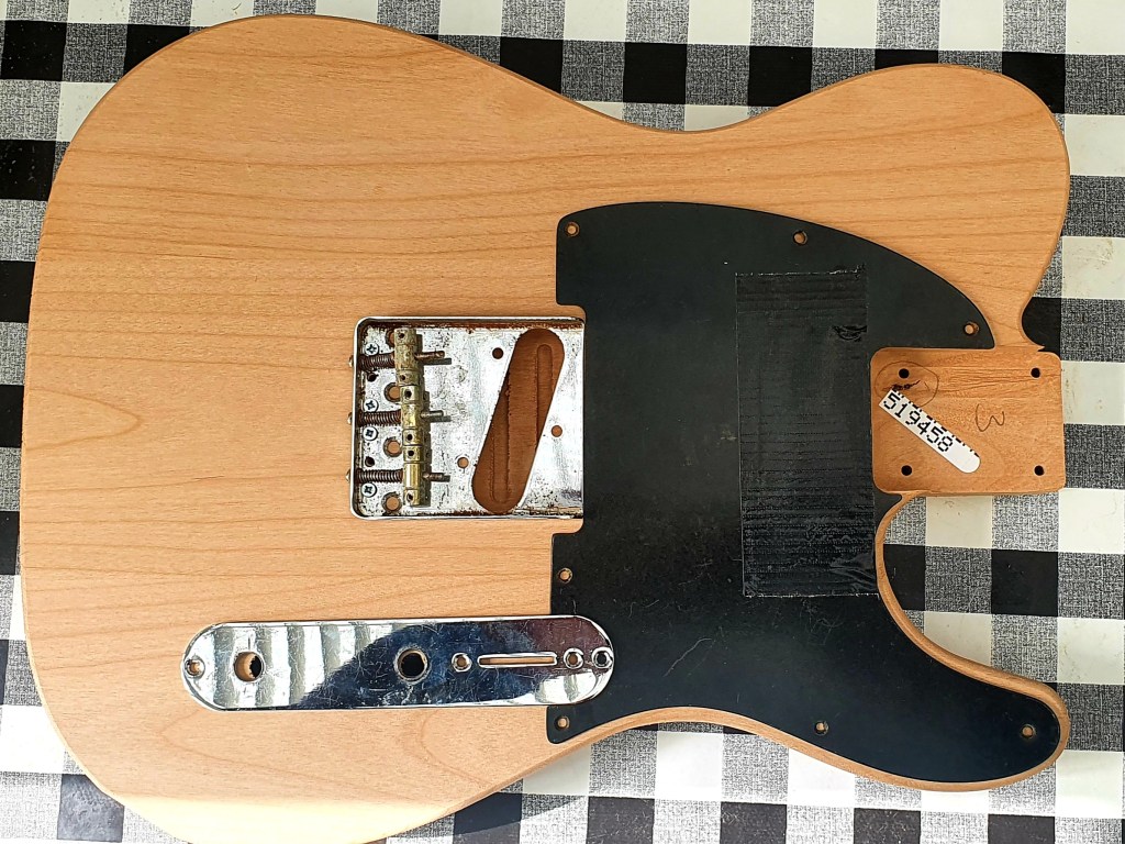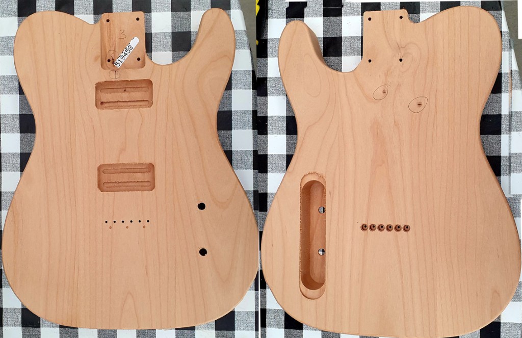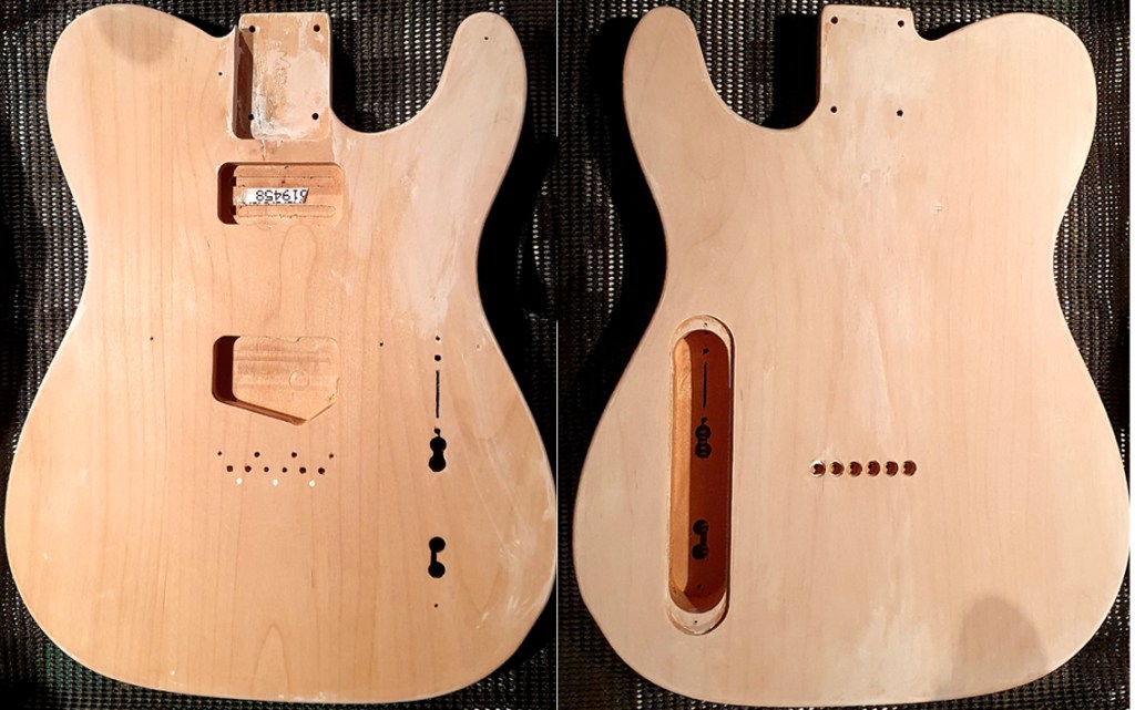 I found a lovely lightweight alder Tele body on the Booboo site that I thought would fit the bill. The only defects were a small natural crack in the wood of the neck pocket and a few tiny indented knots on the back. Oh, and the well for the output jack hadn’t been routed out. I gambled the neck pocket crack wasn’t structural (it was easily remedied with a bit of wood glue) and hit the “buy” button.