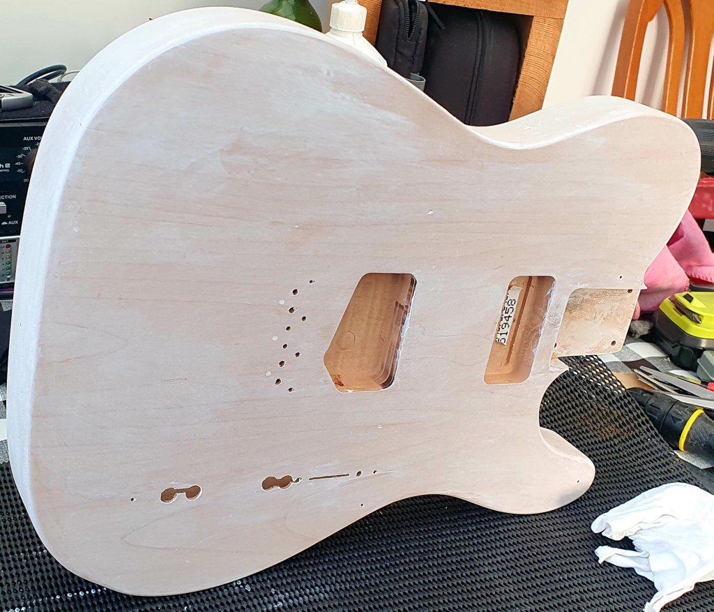 My online researches suggested white acrylic paint (less than a tenner on Amazon) would be as good as anything to give me a whiter colour under the Tru-Oil. I very gingerly rubbed the paint into the body with a cloth, applying several layers, then rubbing them down with fine wet and dry paper and wire wool. I was aiming to lighten the wood’s natural sandy brown colour, but not completely obscure the grain. (It quickly dawned on me that Fender “white blonde” finishes were usually applied, not to alder, but to swamp ash, which is much more highly-figured, allowing the grain to show through strongly.)