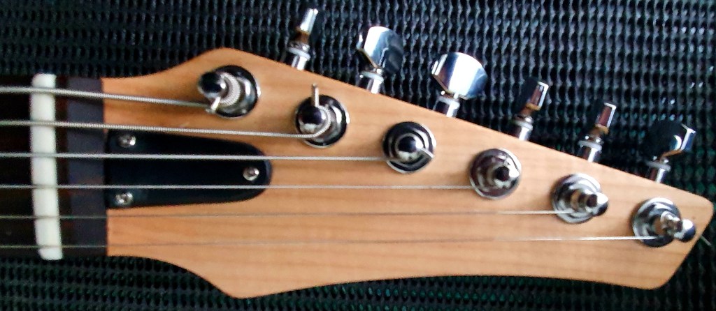 It was then finally time to bolt the thing together, wire up the electrics and string it up. I’ve said it before, it’s always an exciting time when you finally bring all the elements together and turn them into an actual instrument…will the result live up to expectations? This time, I’m happy to report that it worked out really well. Strung up with a beefy set of D’Adario 14-86 strings and tuned B-B (in other words, like a standard guitar, but a fourth down) it took surprisingly little setting up to make my baritone playable. (All credit to the luthier who originally cut the nut and set up the truss rod – necks seldom go on so easily straight out of the box.) The pickups needed winding out closer to the strings than I’d expected, but ended up sounding pretty good, though I still might replace the bridge unit at some stage. It’s a bit on the weak side, but it’ll do for now.